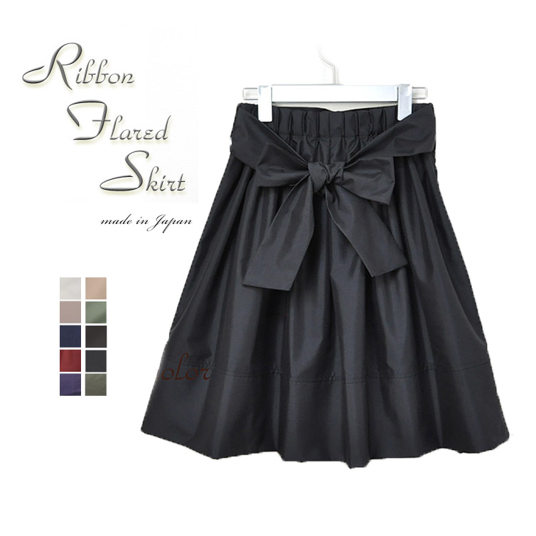 上品なツヤと張りのある質感、綺麗な大きめタックのリボン付ふんわりAラインスカート。