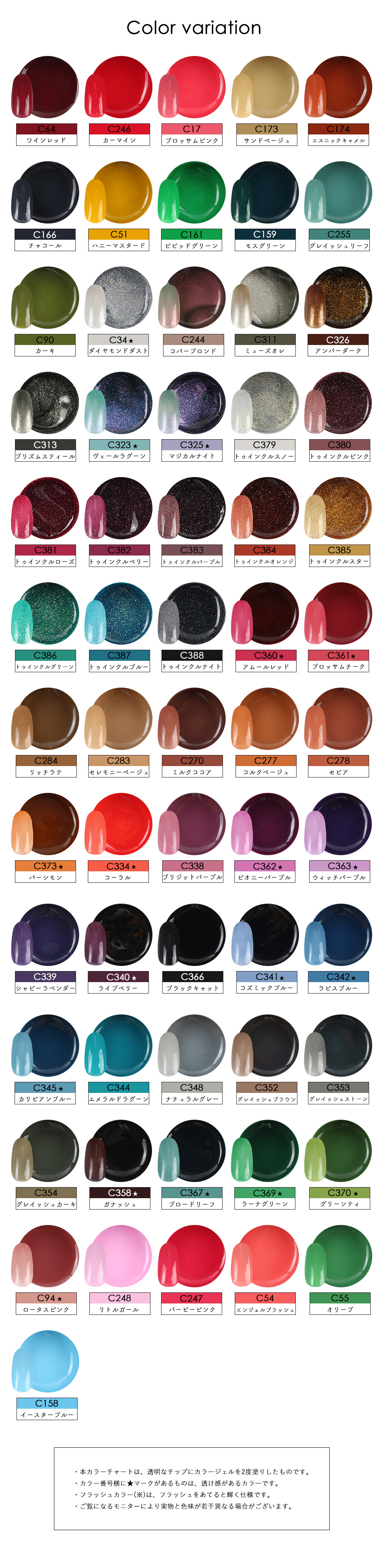 | 注意事項 | ・使用後は、周りに付いたジェルを綺麗に拭き取って保管してください。ソークオフジェルはリムーバーで落とせるジェルです。 ・販売中にやむを得ず、カラーの欠品が生じる場合がございます。大変ご迷惑をお掛けいたしますが、その際は当店よりご連絡致します ・在庫切れカラーをご選択頂きました場合は当店にてカラーをお選びし、出荷の手配をさせて頂きます ・発送準備中のカラー変更に関しましては、状況によりご対応できない可能性がございます ・在庫状況により、一部商品内容に変更がある場合がございます ・カラー番号は連番ではない為、ご注文前に選択カラーに間違いがないかをご確認下さいませ。 ・カラーチャートに無いカラーをお選びの場合は当店にてお選びし出荷とさせて頂きます。 ご了承くださいませ。 ・カラー未選択の場合、カラーは当店にてお選び致します。 予めご注意の上御注文下さいませ。 ・モニターによりカラーの見え方が若干変わりますことご了承ください。 ・カラーの色味によって、顔料の量に違いがある為、ジェルのテクスチャー・硬化時間には若干の個体差がございます。 ・色やラメ・ホログラムの有無によって開封時に見た目の内容量の差が感じられる場合がございます。内容量は全て3gとなっておりますのでご安心下さい。 ・当店取扱いのLEDライト、UVライトに対応しています。UV/LED対応 390-400nm ・入荷時期により、ラベルシールのお色味が異なる場合がございます。 ・ラベルシールの印刷のずれや、手作業でラベルシールを貼り付けているため、 貼り付け位置にずれが生じる場合がございます。ご了承くださいませ。 |