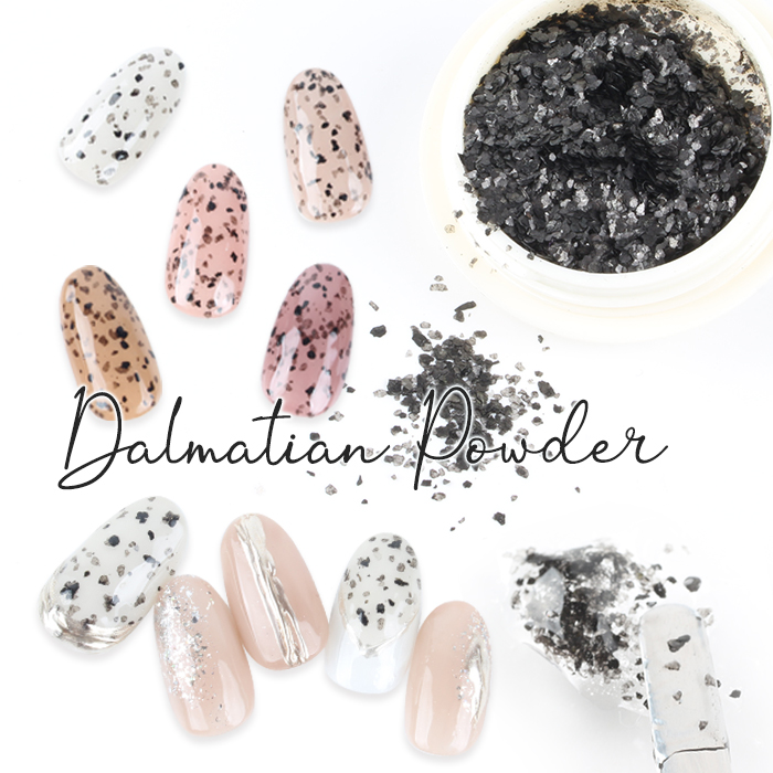 | ご使用方法 | ★クリアジェルと混ぜて使用する場合★ 1.クリアジェルとダルメシアンパウダーを混ぜて準備しておきます 2.お好みのカラージェルをベースカラーに塗布し、ライトで仮硬化します 3.ベースカラーの上に、ダルメシアンパウダーとクリアを混ぜたジェルを塗布します 4.ブラシでパウダーの密度を調節していきます 重ねて塗布すると奥行き感がUP!!塗布しライトで仮硬化します 5.トップジェルを全体に塗布し、ダルメシアンパウダーを埋め込みます 6.ライトで完全硬化させたら完成です♪ ★カラージェルと混ぜて使用する場合★ 1.お好みのカラージェルとダルメシアンパウダーをよく混ぜて準備しておきます 2.ベースジェル塗布後、1で使用したカラーを一度塗りし仮硬化します 3.カラージェルとダルメシアンパウダーを混ぜたジェルを塗布します ※お好みでベースカラーを塗布せず、そのまま塗布してもOK! 4.ブラシでパウダーの密度を調整していきます ※お好みで重ねて塗布することで奥行き感がUP!! 5.トップジェルを全体に塗布し、ダルメシアンパウダーを埋め込みます 6.ライトで完全硬化させたら完成です♪ ダルメシアンパウダーとミキシングするカラーは シアーカラーシリーズがおすすめです☆ ★透け感の少ないカラーと混ぜる場合は、クリアジェルで 透け感を出して使用していただくとよりダルメシアン柄がお楽しみいただけます♪ |