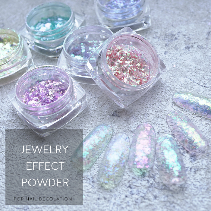 | ご使用方法 | 【アートの上から置いてアートする場合】 未硬化ジェルを利用して、ベースカラーやアートを施した上に直接ペタペタ配置しトップジェルで仕上げるとパウダーを配置した部分が煌めき良いアクセントに♪ 【擦りつける場合】 未硬化ジェルの上からジュエリーエフェクトパウダーを適量のせ、 専用チップで軽く擦りつけていきます。 パウダーが細かく貼りつくので色味や光沢がはっきり発色し、独特な雰囲気に♪ カラーによっては、未硬化ジェルが少ないものもございますので その際は、クリアジェルを薄く塗布し仮硬化後、擦りつけご使用ください。 お好みのアート後、トップジェルを塗布し完全硬化して完成♪ |