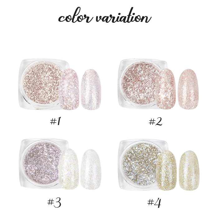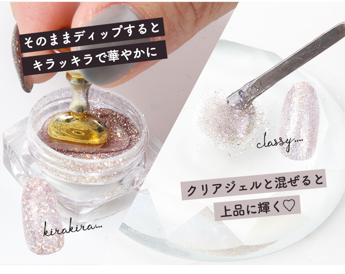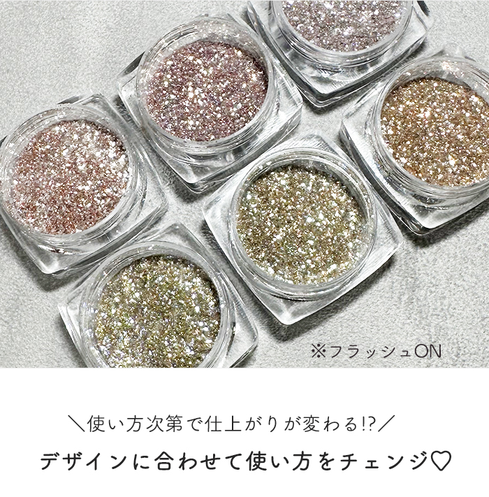 | 商品説明 | フラッシュグリッターとエフェクトパウダーと箔がミックスされた マルチで使えるグリッター!! クリアに混ぜたり、ディップしたり、ネイルデザインのアクセントとして 使ったり、欲張って使えるきらきらグリッター♪ | |