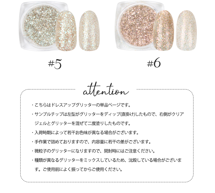 | 注意事項 | ・入荷時期によって若干お色味が異なる場合がございます。 ・手作業で詰めておりますので、内容量に若干の差がございます。 ・微粒子のグリッターになりますので、開封時にはご注意ください。 ・種類が異なるグリッターをミックスしているため、沈殿している場合がございます。 ご使用前によく振ってからご使用ください。 | |