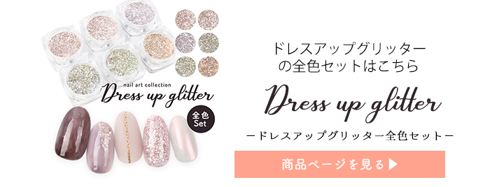 | 作例チップ使用アイテム | ドレスアップグリッター[1]使用プチプラカラージェル C242ユニバース シアーカラーシリーズ C358ガナッシュ カルムカラージェル CL01クリアベージュ CL03シースルーライラック ネイルオンジュエリー[247]スリムスネイクチェーン [人差し指デザイン]クリアジェル塗布して、その上からドレスアップグリッターを使用 [薬指デザイン]クリアジェル塗布後、ドレスアップグリッターにディップして硬化後、 余分なパウダーを払い、トップジェルを塗布して完成 | |