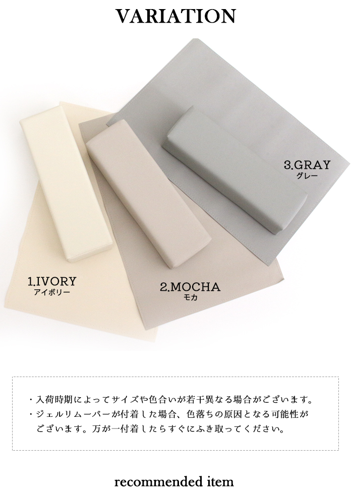| 注意事項 | ※入荷時期によってサイズや色合いが多少異なる場合がございます ※ジェルリムーバーが付着した場合、色落ちの原因となる可能性がございます。 万が一付着したらすぐにふき取ってください。 |