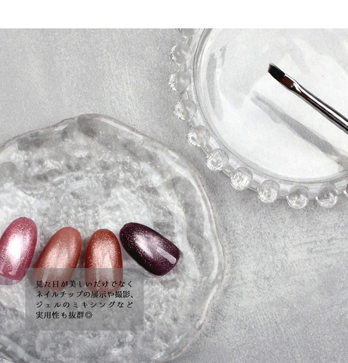 | 商品説明 | ネイルチップの展示や撮影、ジェルのミキシングに使える! 実用性抜群のパレット! 2種類それぞれ違った形状なので、撮影やブラシスタンド、パーツ置き等 いろんなシーンでお使いいただけます。 |