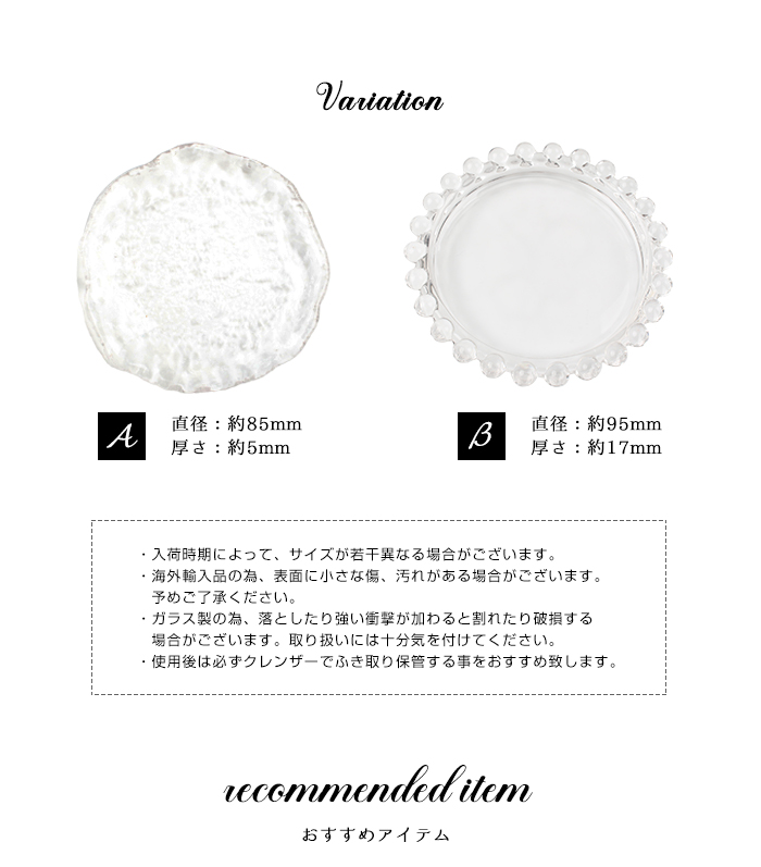 | 注意事項 | ・入荷時期によってサイズや形状が多少異なる場合がございます。 ・海外輸入製品の為、表面に小さな傷、汚れがある場合がございます。 ・ガラス製の為、落としたり強い衝撃が加わると割れたり破損する場合がございます。 取り扱いには十分ご注意ください。 ・使用後はクレンザーでふきとり保管をすることをおすすめいたします。 ・A,Bそれぞれ本体の形状が異なります。Aは、裏面が凸凹しているため撮影にもピッタリ! Bは、お皿のような形状となっております。パレットの縁にブラシをおいて ブラシスタンドとしてもご使用可能です。 |