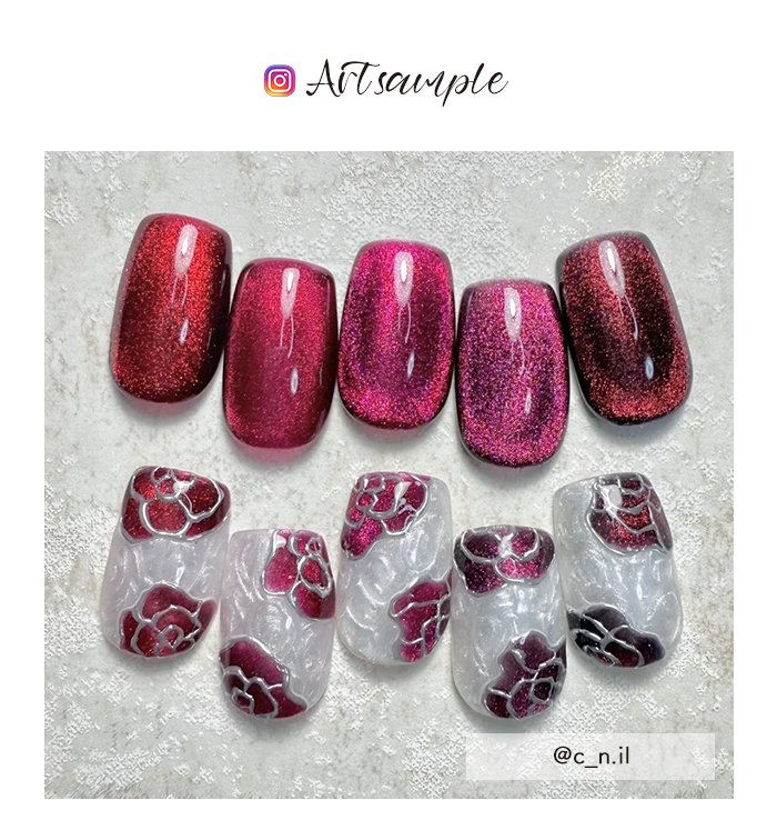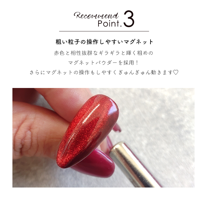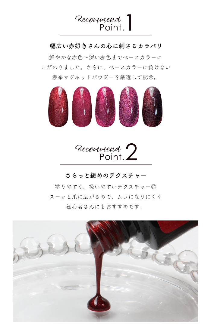 | 商品説明 | 赤好きが赤好きさんのために選んだレッドマグネットジェル。 幅広い赤好きさんに刺さる5色のカラーバリエーションをご用意! 鮮やかな赤色から深い赤色までベースカラーにもこだわりました◎ さらに、ベースカラーに負けない赤系マグネットパウダーも厳選して配合! ギラギラとした粗い粒子のマグネットが、より赤色を際立たせ ゴージャスな爪先に♪ 今日こそは!っと、気合を入れたい時におすすめしたいマグネットジェルです!! |