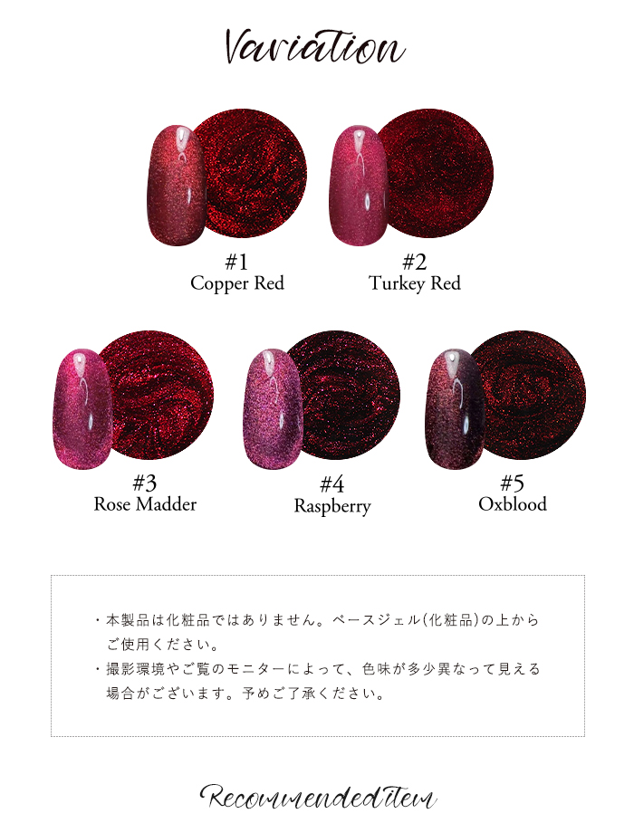 | カラー/内容量 | 【1】カッパーレッド 【2】ターキーレッド 【3】ローズマダー 【4】ラズベリー 【5】オックスブラッド 4ml |