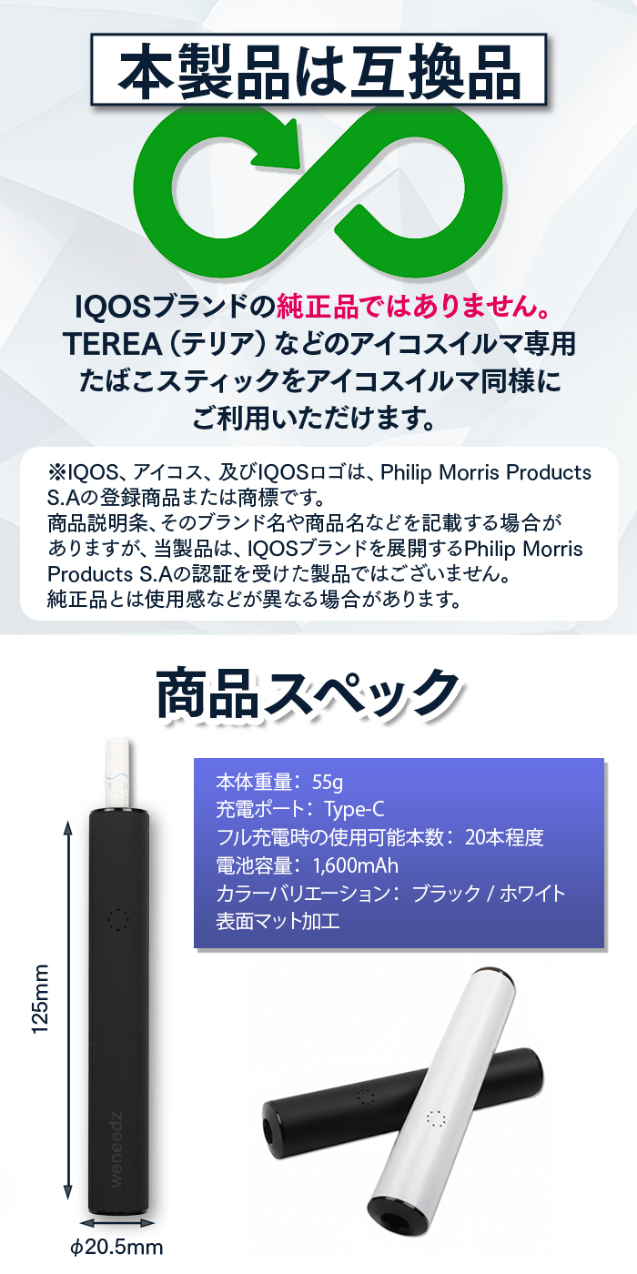 | 商品説明 | タバコ代が半額に!? 「これ1本で2度吸いができる」アイコスイルマ互換機です。 お手持ちのアイコスイルマで一度吸い終わったタバコスティックTEREA(テリア)やSENTIA(センティア)をweneedzN1でもう一度吸引できます。 通常モードと2度吸いモードを搭載!純正本体の充電切れやお手元に無い場合も、通常モードで喫煙も可能です。 ※本製品の通常モードで使用したスティックは2度吸いはできません。 3D加熱方式を採用し、強い吸いごたえを実現しました! お掃除不要で常に清潔 新たな加熱方式により、本体破損もなく、使用後のお掃除も不要です。 吸い終わった後の葉っぱが詰まるなどのストレスもなく、清潔にご利用いただけます。 |