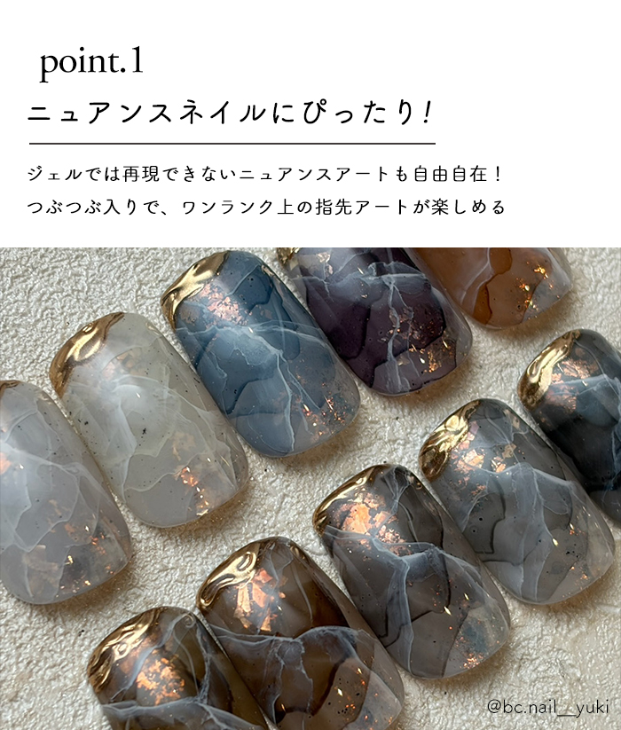 | 商品説明 | ■垂らすだけで、こなれニュアンス。 つぶつぶ入りの「クラックウォーターリキッド」は、 じわっと広がるひび割れ風デザインが楽しめるネイルアート用リキッド。 ぽたりと垂らすだけで、 偶然が生み出す唯一無二のニュアンスアートが完成します。 ■つぶつぶ入りで奥行き感アップ 粒がランダムに広がり、 普通のインクネイルとはひと味違う立体的な表情に。 ニュアンスネイルやインクアート、 抜け感デザインにもぴったり。 ■初心者さんでも簡単 特別なテクニックは不要。 未硬化ジェルの上に垂らすだけで、 自然に広がるアートが完成します。 セルフネイルでもサロン級の仕上がりへ。 ■こんな方におすすめ ・ニュアンスネイルが好き ・人と被らないデザインを楽しみたい ・簡単にアートの幅を広げたい ・インクネイルが好き |