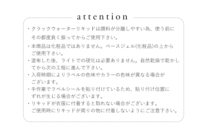 | 注意事項 | ・本製品は化粧品ではありません。ベースジェル(化粧品)の上からご使用ください。 ・肌に直接使用しないでください。 ・換気の良い場所でご使用ください。 ・使用後はしっかりキャップを閉めて保管してください。 ・お使いのモニターにより色味が異なって見える場合があります。 |