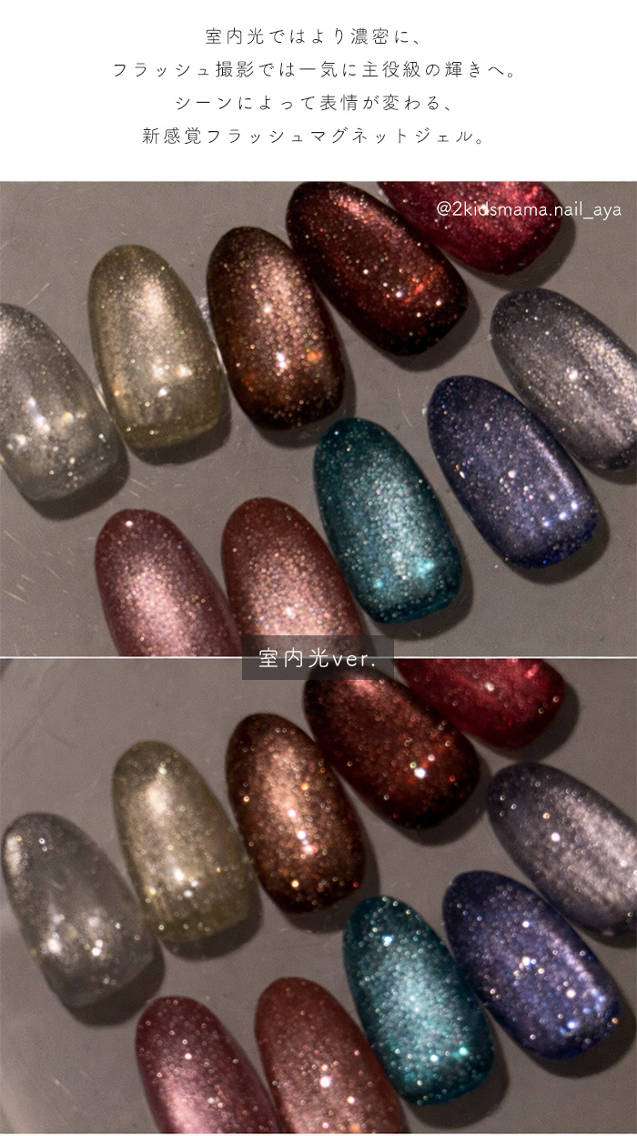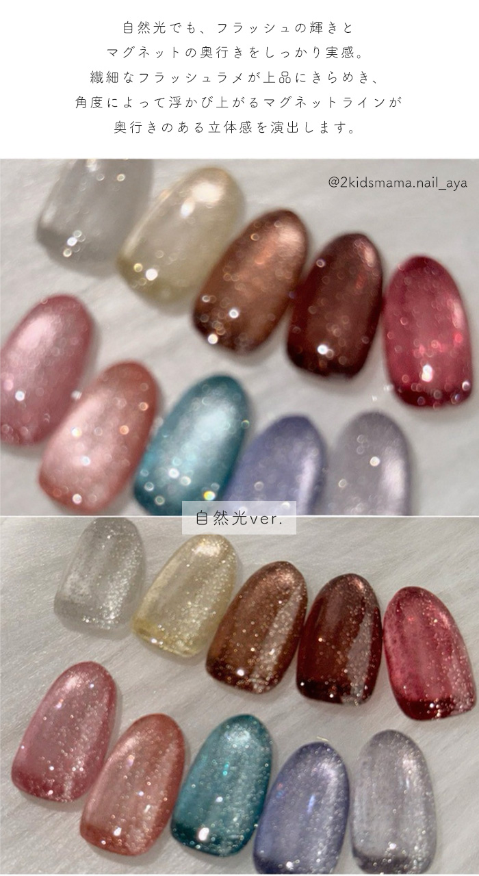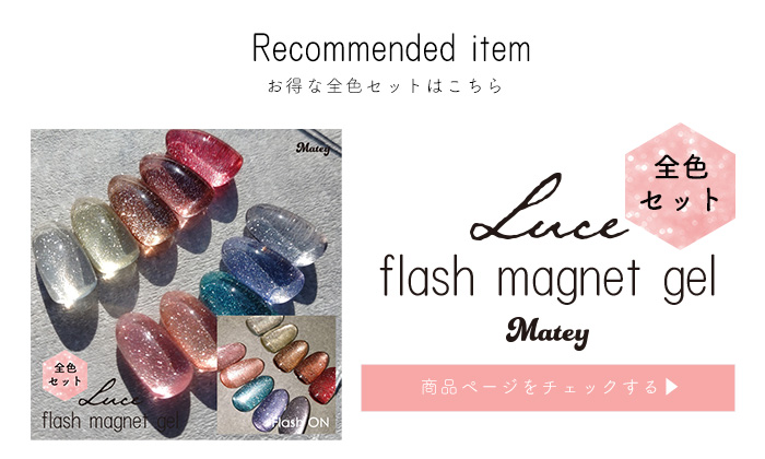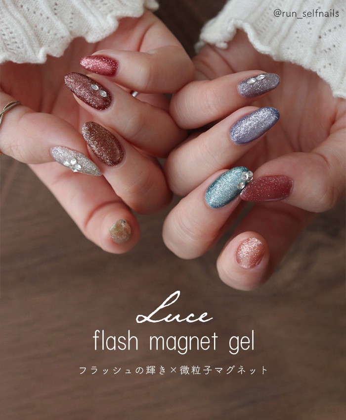 | 商品説明 | Luce フラッシュマグネットジェルは、 繊細なフラッシュラメの輝きと、磁石で操る光のラインが重なり合うことで 奥行きのある立体感を生み出します。 自然光や太陽光の下では、透明感のある上品なきらめき。 室内光では濃密な艶感を演出し、 フラッシュ撮影では一瞬で視線を奪う華やかな輝きへ。 角度や光によって表情を変えるため、 シンプルなワンカラーでも存在感のある仕上がりに。 ・自然光でもしっかり輝くフラッシュラメ ・磁石でつくる奥行きデザイン ・初心者でも扱いやすいテクスチャー ・サロン級の立体感ネイルを自宅で 日常の光の中でも美しく、特別な瞬間にはさらに輝く。 光で魅せる、新感覚フラッシュマグネットジェルです。 |