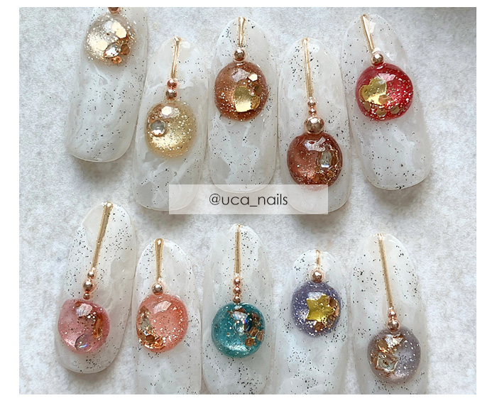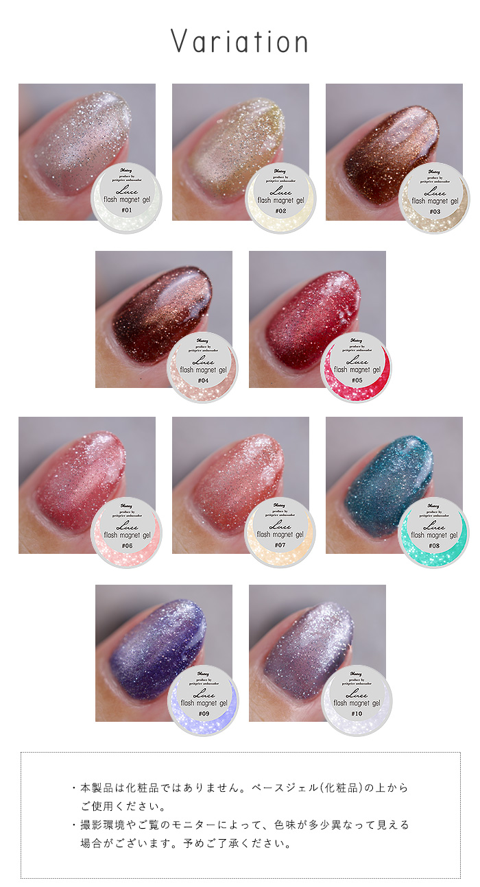 | 注意事項 | ・本製品は化粧品ではありません。ベースジェル(化粧品)の上からご使用ください。 ・ラベルシールの印刷のずれや、手作業でラベルシールを貼り付けているため、貼り付け位置にずれが生じる場合がございます。 ・当店取り扱いのUV/LEDライトに対応しています。 ・塗布量や撮影環境、モニターによって、色味の見え方が異なる場合がございます。 |