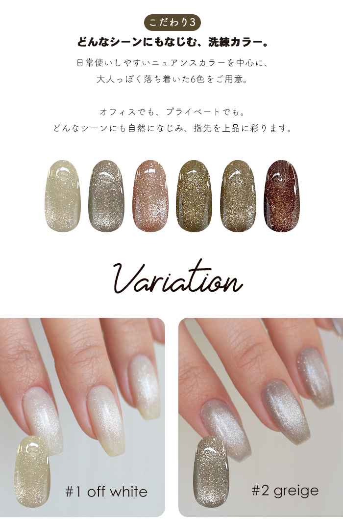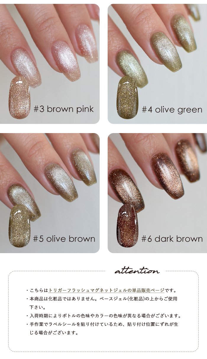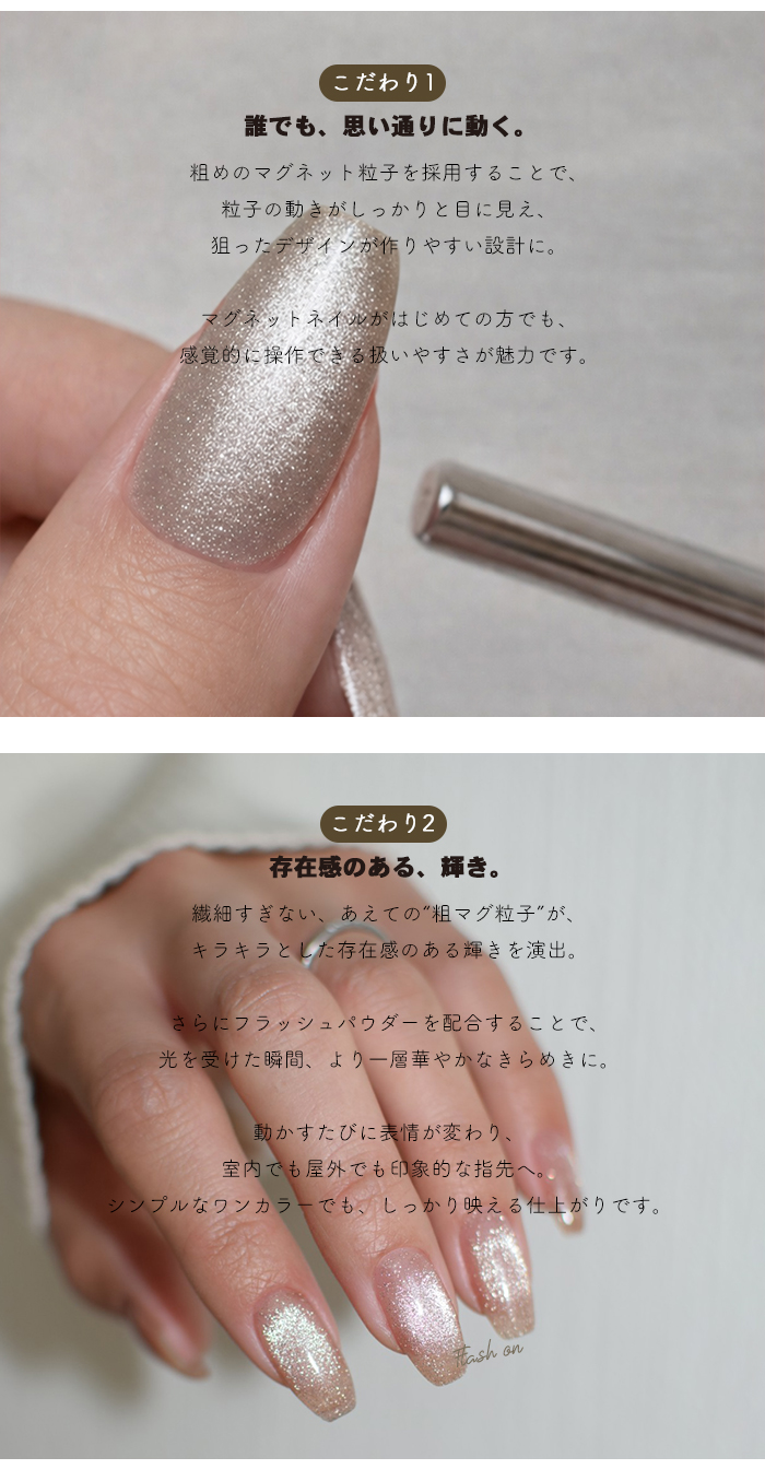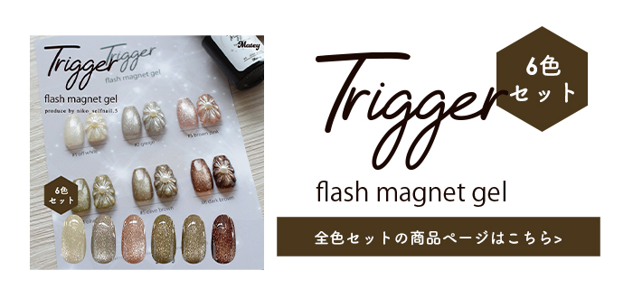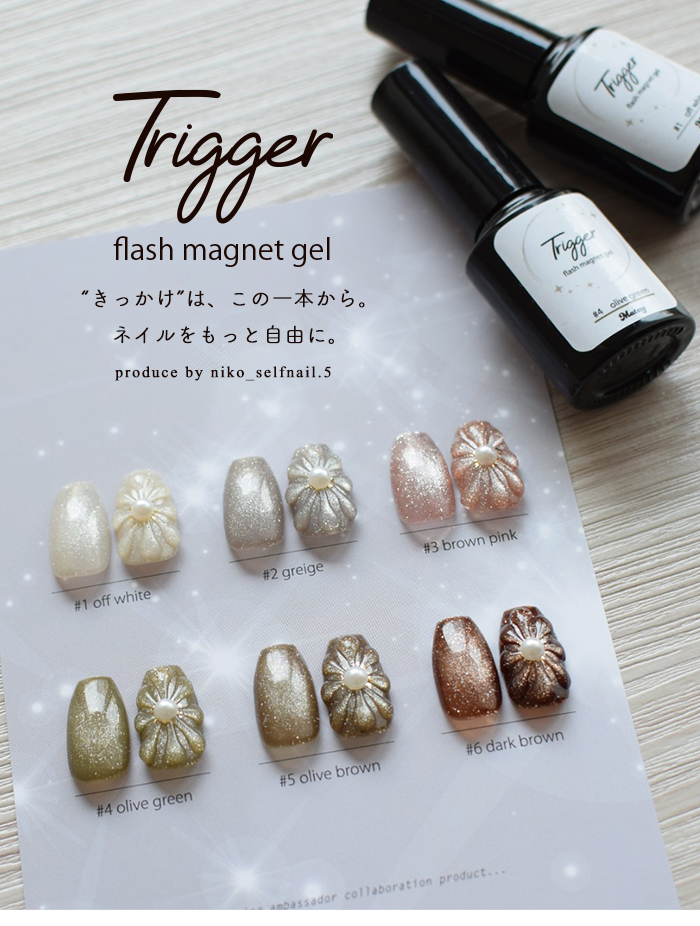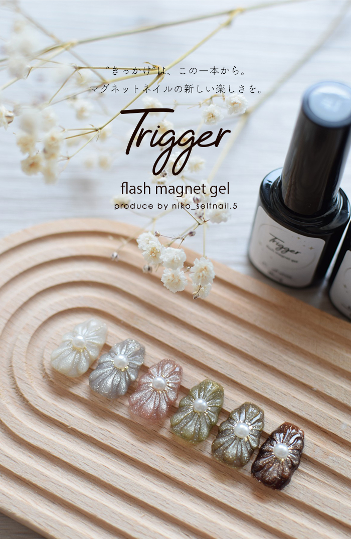 | 商品説明 | アンバサダーにこさんコラボ Trigger Flash Magnet(トリガーフラッシュマグネット) 洗練された輝きと、操作性を両立したフラッシュマグネットジェル。 “きっかけ”から生まれたジェル “Trigger(トリガー)”=きっかけ・引き金。 ・マグネットネイルを始めるきっかけに ・苦手意識を「楽しい!」に変えるきっかけに ・微粒子派の方が粗マグの魅力に出会うきっかけに にこさんの「もっとマグネットを楽しんでほしい」という想いから誕生しました。 ◆ 高輝度フラッシュのような存在感 粗めのマグネット粒子が、 角度によって表情を変える立体的な輝きを演出。 ワンカラーでも奥行きのある仕上がりに。 ◆ 思い通りに動く操作性 粒子の動きが見えやすく、磁石操作もスムーズ。 ライン・グラデーション・ニュアンスなど、 セルフでも自在にデザイン可能。 ◆ 初心者にも扱いやすい設計 「マグネットは難しい」そんなイメージを覆す、 扱いやすいテクスチャー。 初めての方にもおすすめです。 ◆ 日常に溶け込むニュアンスカラー 落ち着きのあるシックな6色展開。 |