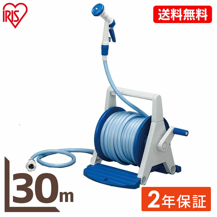 (アイリスオーヤマ)レバーの握り加減で水量調整ができる「水量調整アクアガンAGRM-600T」を搭載したハイパーリールです。水流は「キリ・ジェット・シャワー・ジョーロ・カクサン・ストップ」の6パターンです。耐圧糸入り防藻ホース30m付きです。グリップエンド部分にねじれ防止キャップを採用しているので、ホースがねじれません。折りたたみ可能なステップ付きで安定感があります。