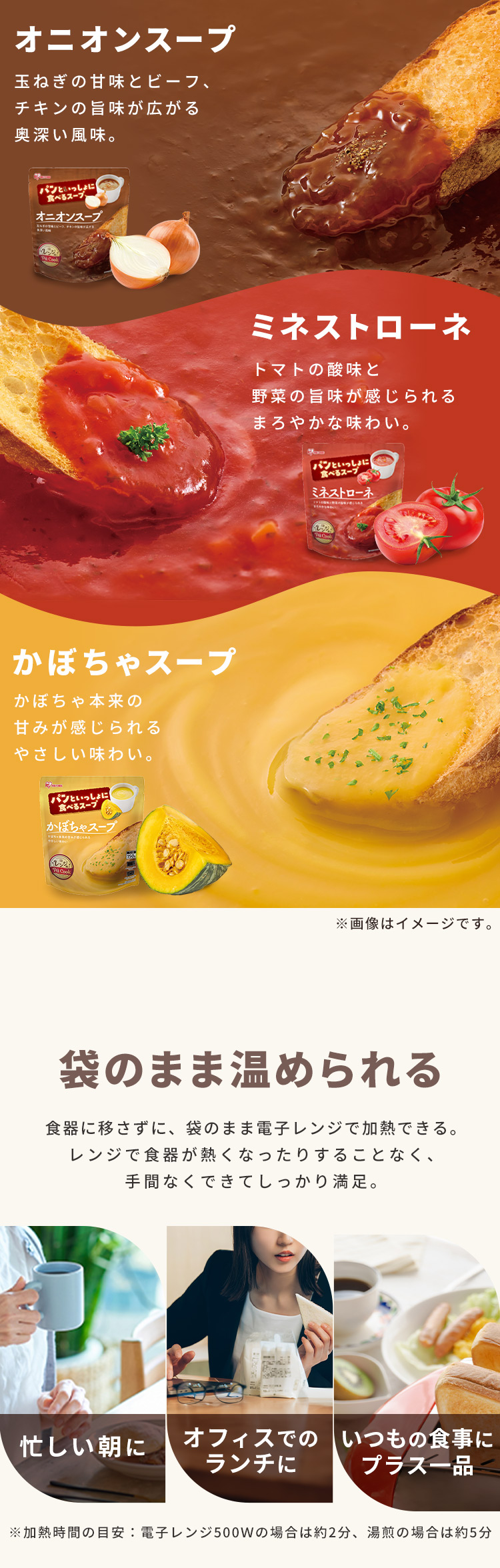 温めるだけで、やさしい味わいのスープがすぐに食べられる。