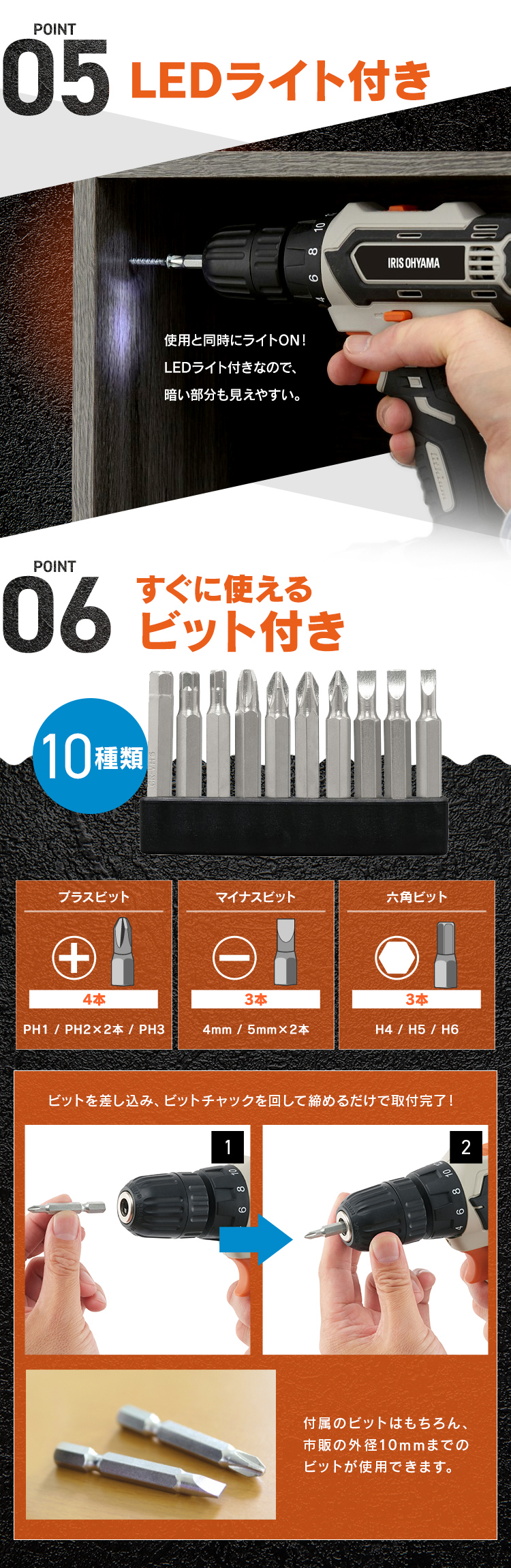 ビットを差し込み、ビットチャックを回して締めるだけで取付完了!