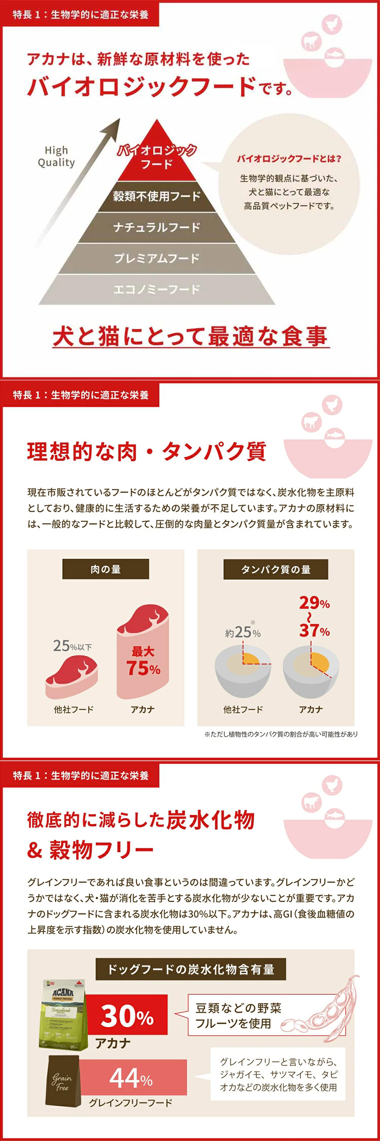 犬は本来肉食です。ですから、バラエティ豊かな肉をたっぷり含んでいながらも、フルーツと野菜の量を抑えた食事が適しています。アカナ アダルトスモールブリードレシピは放し飼い鶏肉、天然魚、新鮮平飼い卵を使用しており、新鮮な状態でキッチンまで届けられた風味豊かな栄養がホールプレイ比率でギュッと詰まっています。米、タピオカ、ジャガイモといった消化吸収が早い炭水化物は使用せず、豊富な肉たんぱく質が愛犬を最高の健康状態へと導きます。