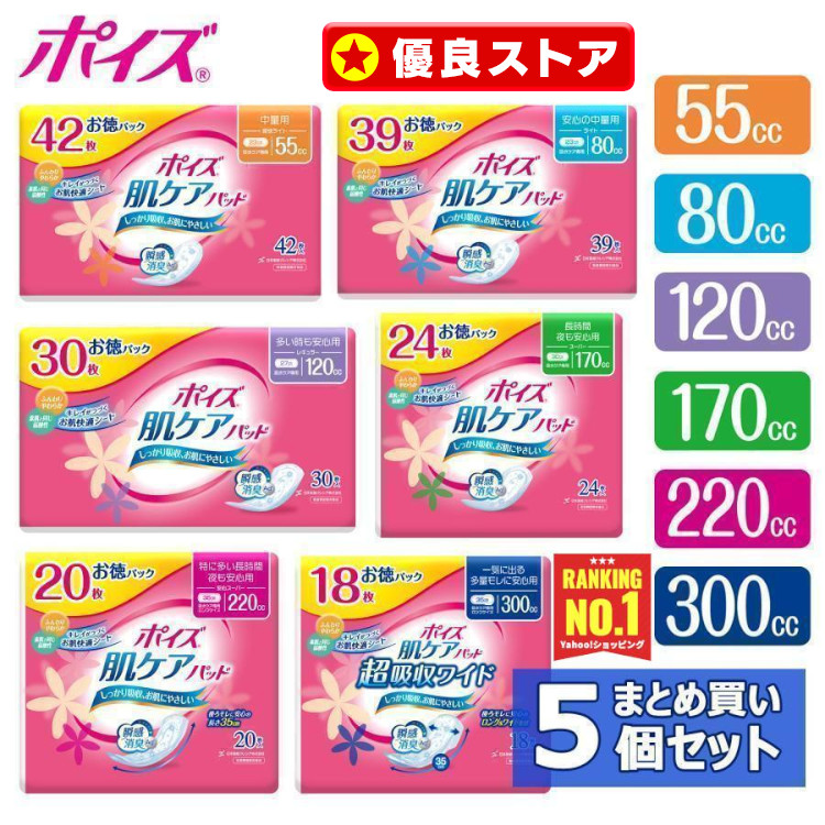 尿漏れパット 吸水ナプキン ポイズ 尿もれ ポイズパッド 肌ケアパッド 5個セット 55cc 80cc 120cc 170cc 220cc 300cc 日本製紙クレシア