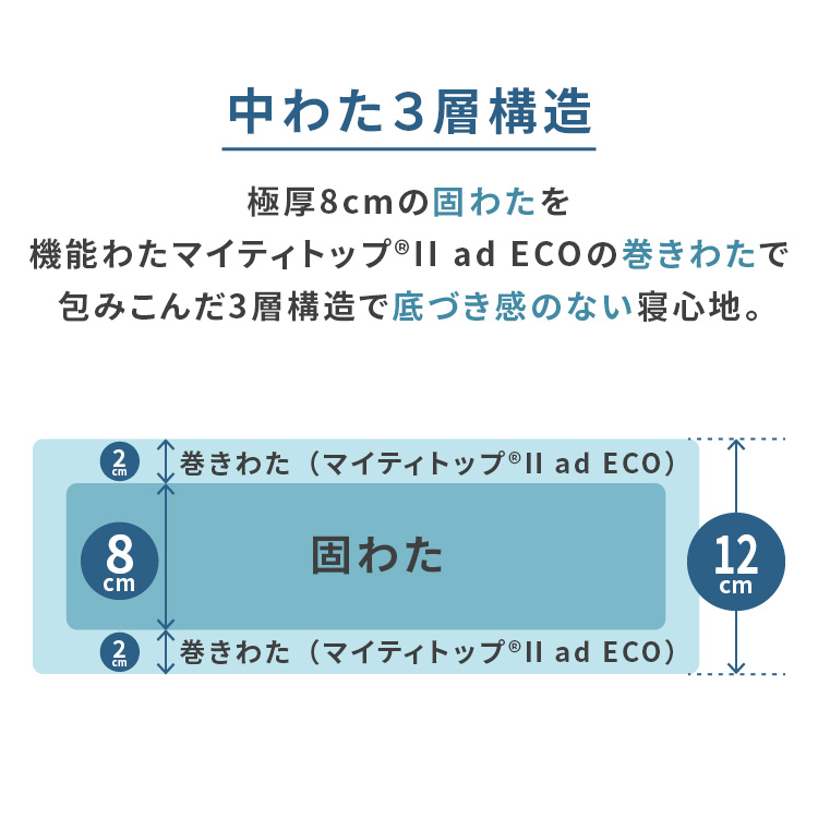 抗菌防臭・防ダニ機能付きで、ボリュームも12cmと床付き感がないしっかりした三層敷き布団になります。