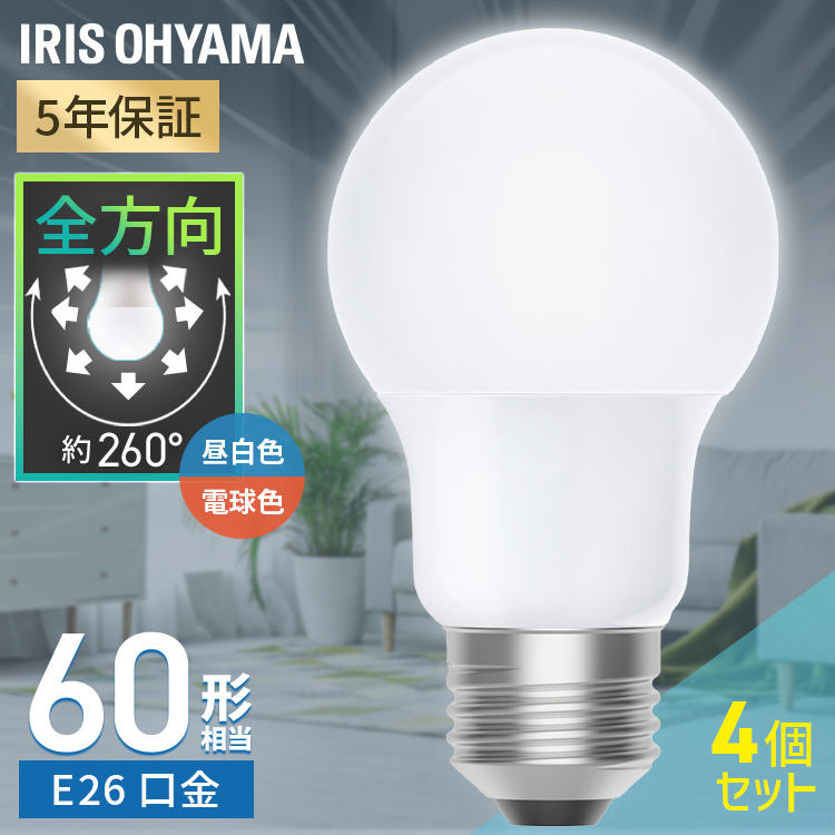 (検索用:4個 led電球 e26 60w 相当 昼白色 電球色 全方向タイプ 5年保証 LED 電球 E26 アイリスオーヤマ 4967576773461 4967576773478)