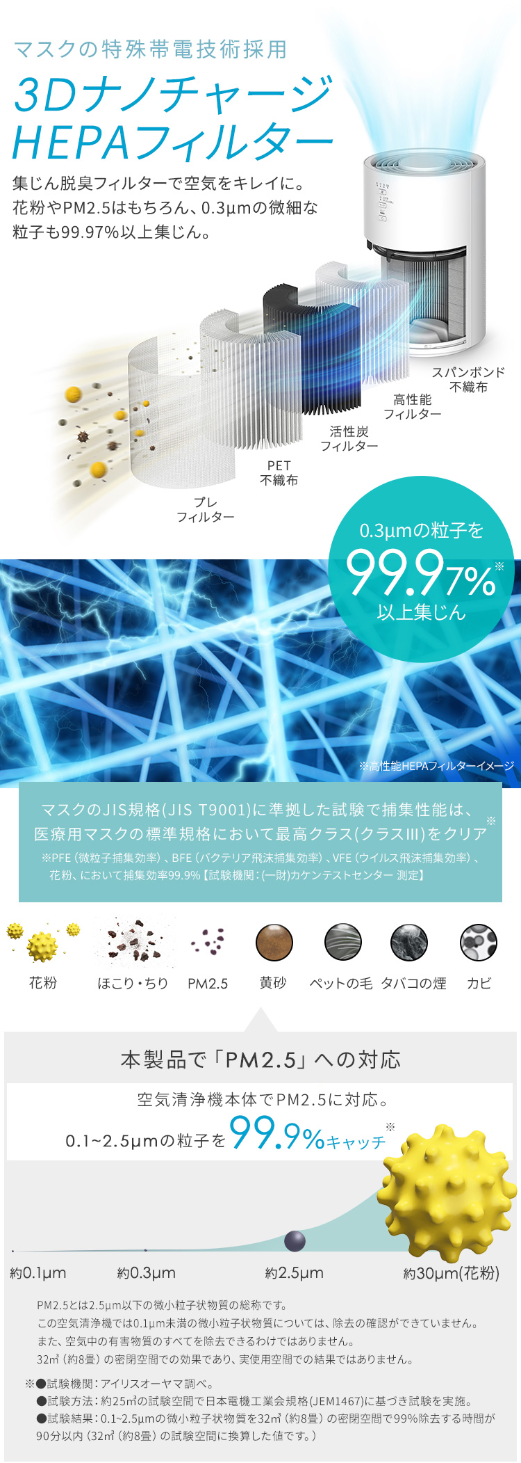 花粉やPM2.5はもちろん、0.3μmの微細な粒子も99.97%以上集じん。