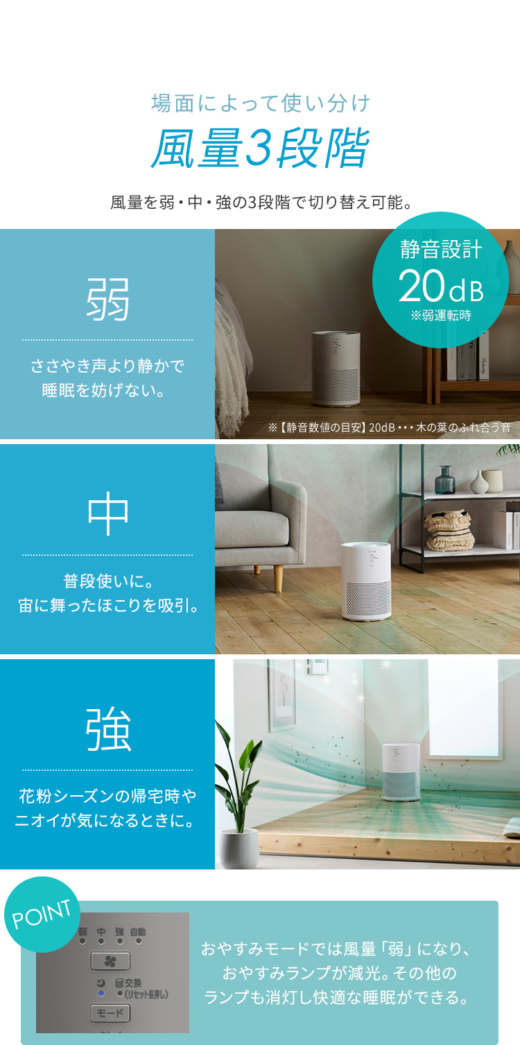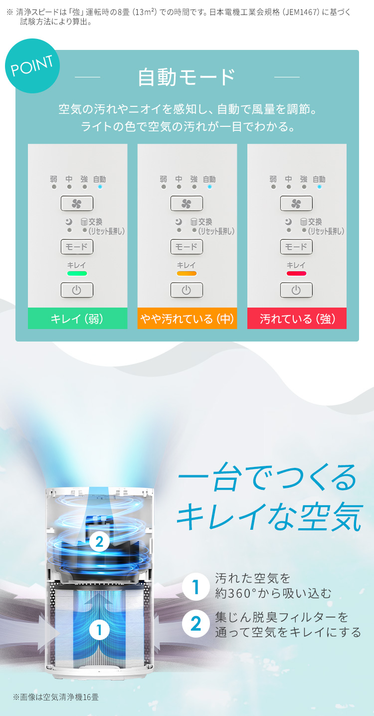 汚れた空気を一気に取り込み、キレイな空気が部屋の隅々まで素早く行き渡るスピード空気清浄。