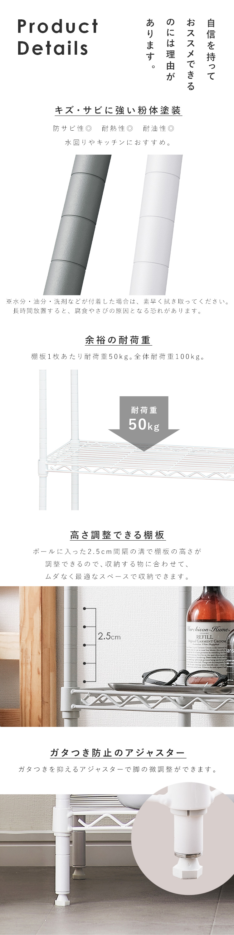耐荷重は、棚板1枚当たり50kg、全体で100kgです。