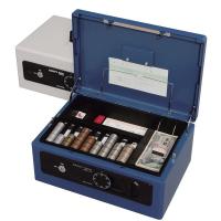 シリンダー錠とダイヤル錠のダブルロックの手提げ金庫です。シリンダー錠とダイヤル錠が付いているので、中のものを安全に保管することができます。振動を察知して警告音が鳴る防犯ブザーが付いています。小銭の整理に便利なコインカウンターが付いています。コインカウンタートレーは取り外して使用できます。A4版の書類が入るサイズです。