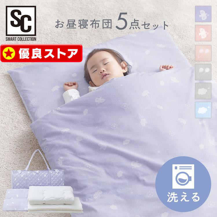 掛け布団・敷き布団・掛け布団カバー・敷き布団カバーに収納バッグが付いた、お昼寝布団5点セットです。