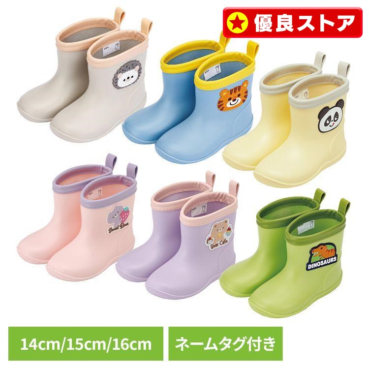 キャラクターのワッペンがポイントのキッズレインブーツ!他人の靴と間違えないネームタグ付き。