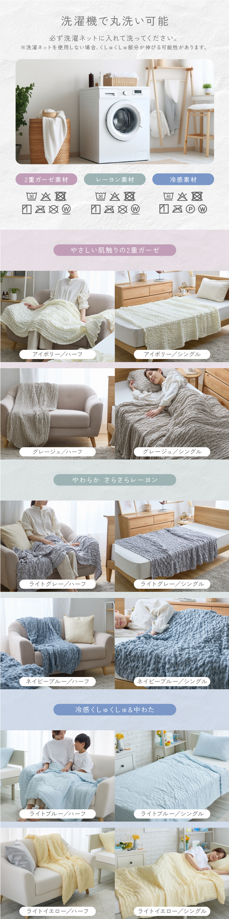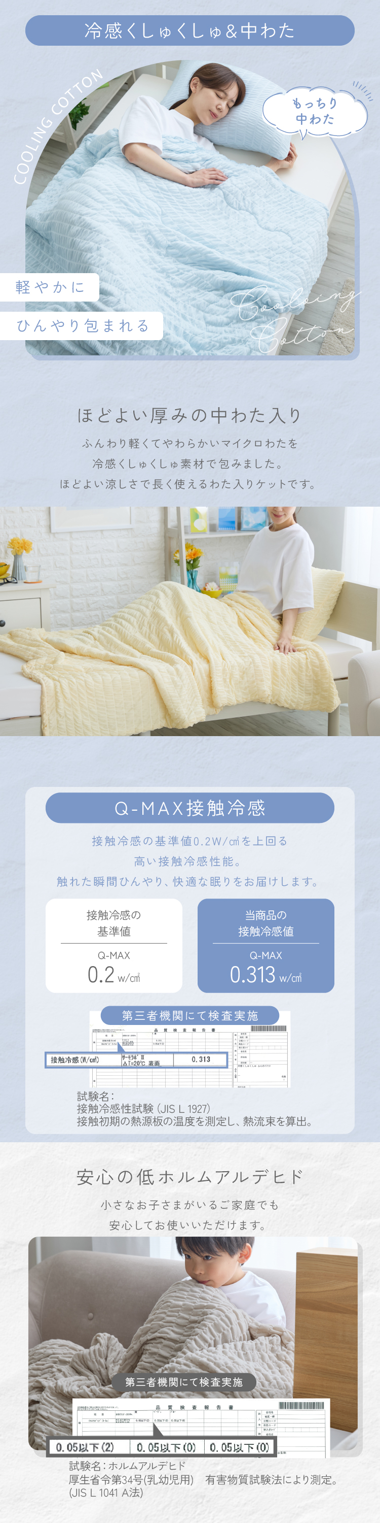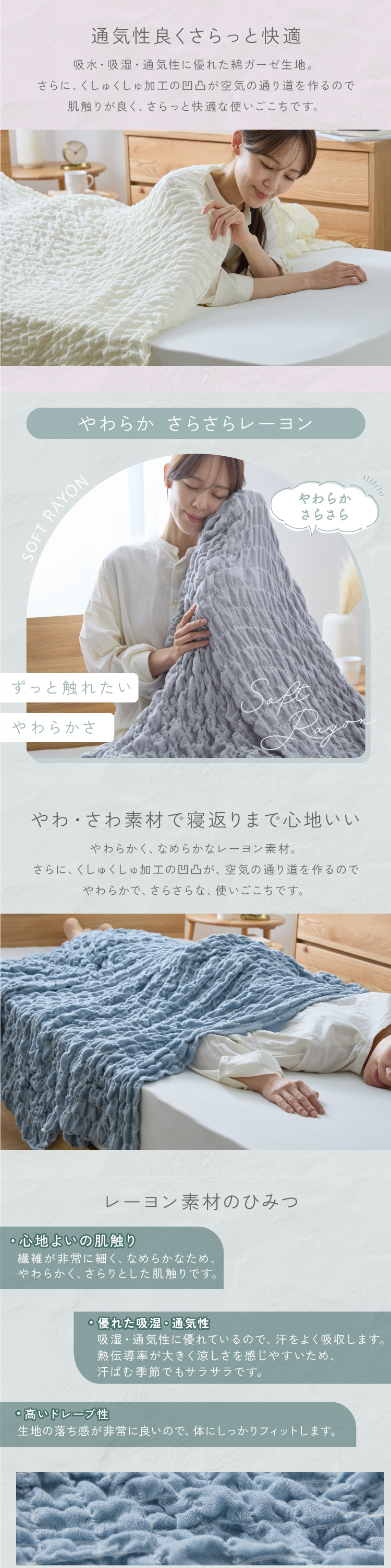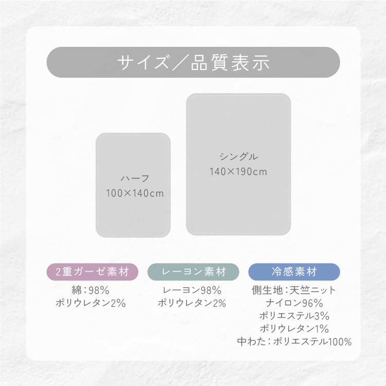 くしゅくしゅした風合いの冷感生地を使用した中わた入りケットです。