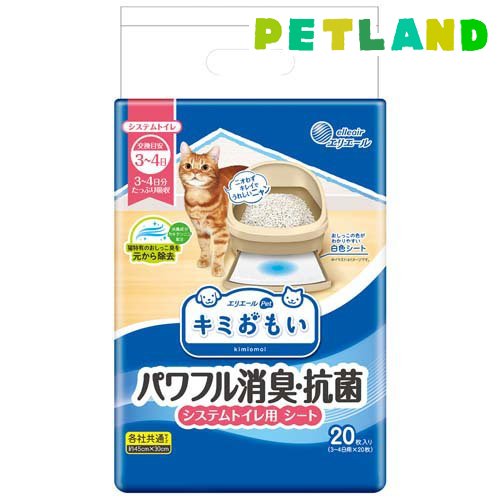 キミおもい パワフル消臭・抗菌 システムトイレ用シート 3〜4日用(きみおもい/君おもい/エリエール/えりえーる/エリエールペット/えりえーるぺっと/キミオモイ/猫トイレ/猫シート/ペットトイレ/猫おしっこ/猫オシッコ)/猫用品/ブランド:キミおもい/【発売元、製造元、輸入元又は販売元】大王製紙/【キミおもい パワフル消臭・抗菌 システムトイレ用シート 3〜4日用の商品詳細】●ネコちゃんのおしっこ特有のニオイにも対応する消臭成分「カキタンニン」を配合。3〜4日分のおしっこをしっかり消臭して、交換するときまで効果が長続き!キレイ好きなネコちゃんもニオイが気にならずにトイレを使えます。●3〜4日分のおしっこをたっぷり吸収&パワフルに消臭。こまめに交換したい方にぴったり。●シートの端まで吸収体が入っているので、隅っこにしたおしっこも漏らさずにしっかり吸収します。●白色シートでおしっこの色を確認しやすい。●小さめのトレー、大きめのトレー、どちらにもぴったりフィットするサイズで端モレも安心です。/cate20230