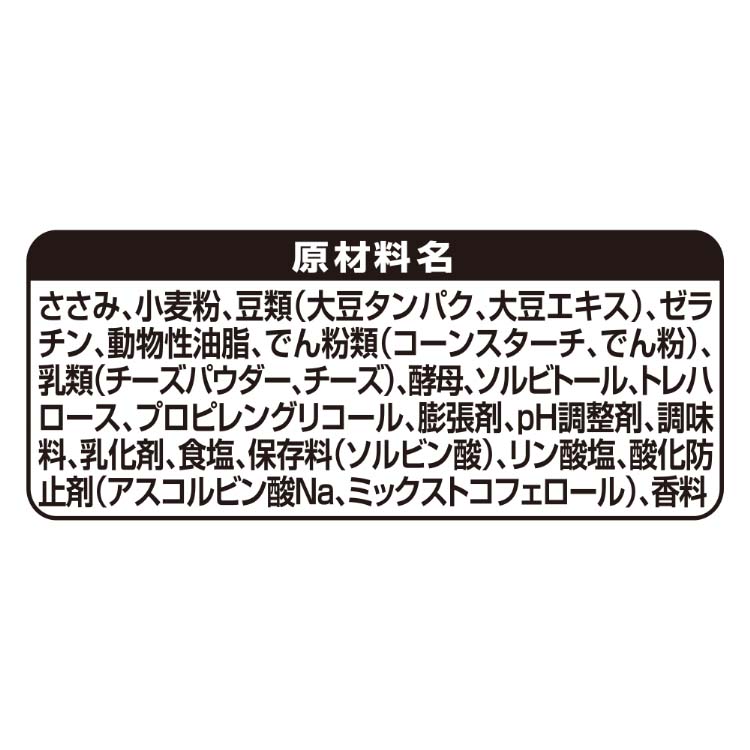 ささみ、小麦粉、豆類(大豆タンパク、大豆エキス)、ゼラチン、動物性油脂、でん粉類(コーンスターチ、でん粉)、乳類(チーズパウダー、チーズ)、酵母、ソルビトール、トレハロース、プロピレングリコール、膨張剤、pH調整剤、調味料、乳化剤、食塩、保存料(ソルビン酸)、リン酸塩、酸化防止剤(アスコルビン酸Na、ミックストコフェロール)、香料