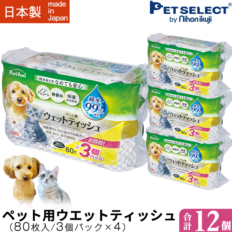 (お買い得/12個) ペット用 ウエットティッシュ 80枚入3個パック×4 furifuri ペットウエット 純水99%使用 なめても安心 送料対策