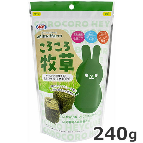 ・おいしくって栄養豊富なアルファルファをぎゅっと圧縮!ほどよい硬さでかじって遊べる“ころころタイプ”の牧草です。