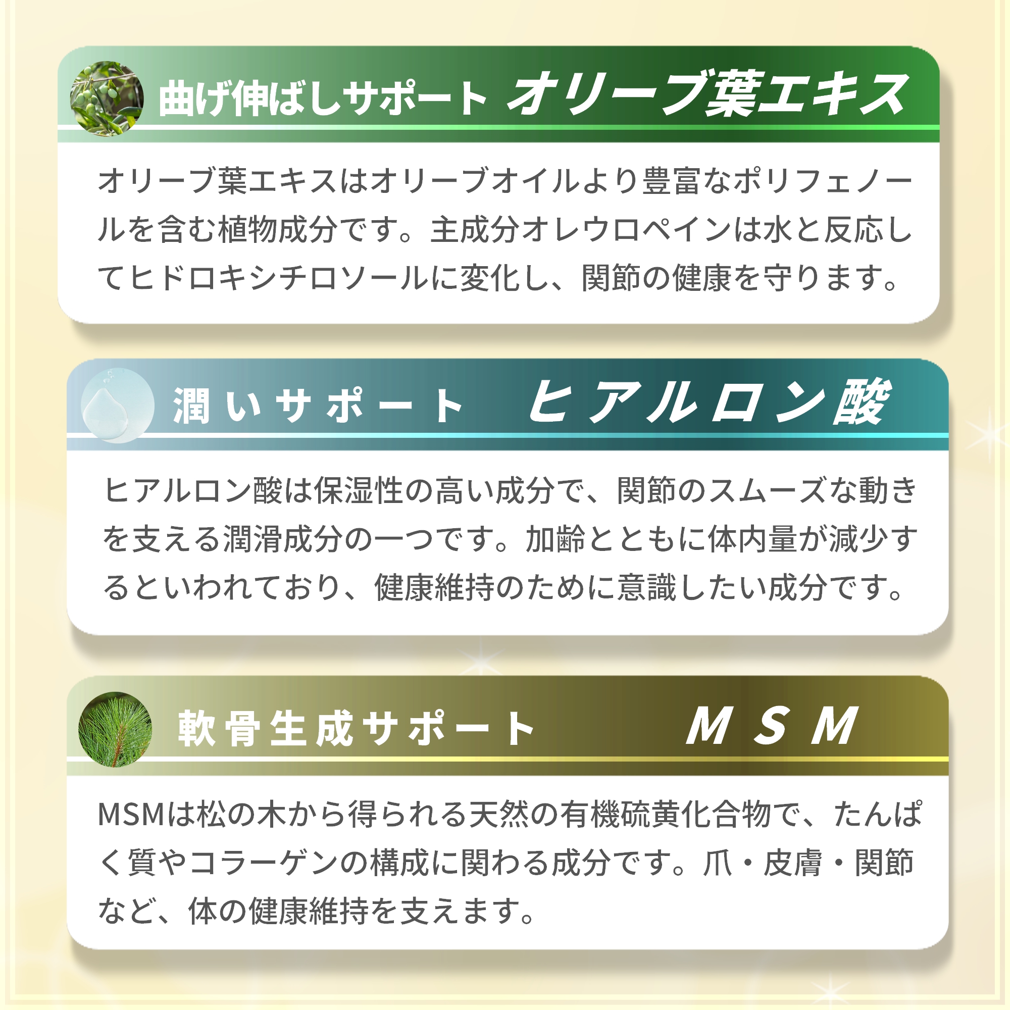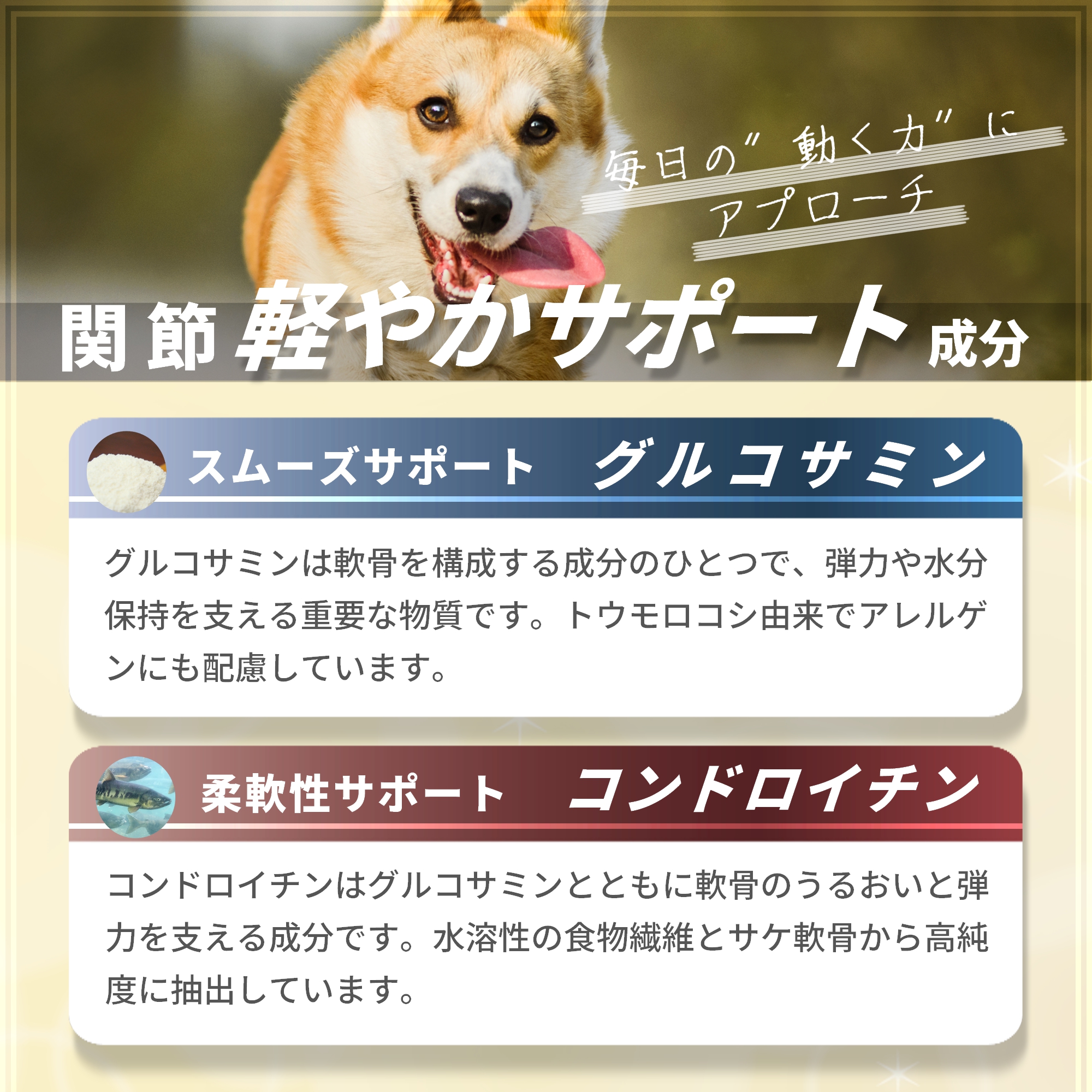 米粉、ビール酵母、チキンエキス、デキストリン、グルコサミン、ムラサキイモ末、サケ軟骨抽出物(コンドロイチン含有)、レバーエキス(豚)、MSM、ビタミンC、プロポリスエキス末、オリーブ葉エキス末、ヒアルロン酸