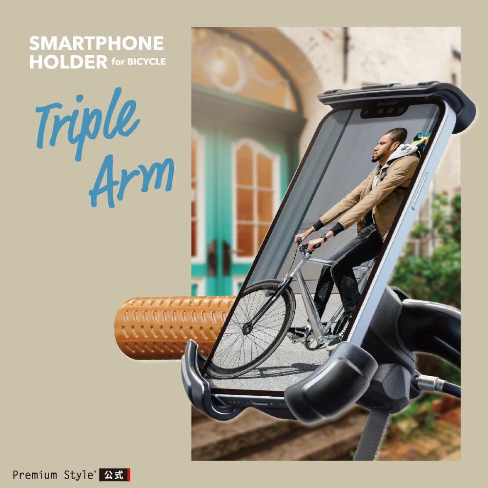 トリプルアームでスマートフォンをしっかり固定する自転車用 スマートフォンホルダー(アームタイプ)です。ロック機能が付いた伸縮するアームがスマートフォンをしっかりホールドします。また、取り外しできる可動式ステー採用で、スマートフォンをホルダーごと取り外しが可能です。360°回転する為、シーンに応じて最適な角度に調整が出来ます。ハンドル部へ固定はフレキシブルネジ式ステーで簡単に取り付け・取り外しが可能です。※対応スマートフォンサイズ:横幅55〜85mm×高さ130〜165mm×厚み7〜13mm。※対応ハンドル径:19〜40mm