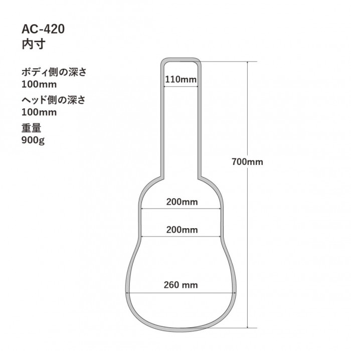 | サイズ | 全長:700mm、ネック幅:110mm、ボディ上部幅:200mm、ボディくびれ部幅:200mm、ボディ下部幅:260mm、ボディ側の深さ:100mm、ヘッド側の深さ:100mm個装サイズ:75×31×12cm |