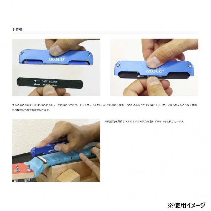 アルミ製のホルダーには3つのマグネットが内蔵されており、ナットファイルをしっかりと固定します。そのためしなりやすい薄いナットファイルも曲がることなく快適かつ精密な作業が可能となります。切削部分を目視しやすくするため試作を重ねデザインを改良しています。