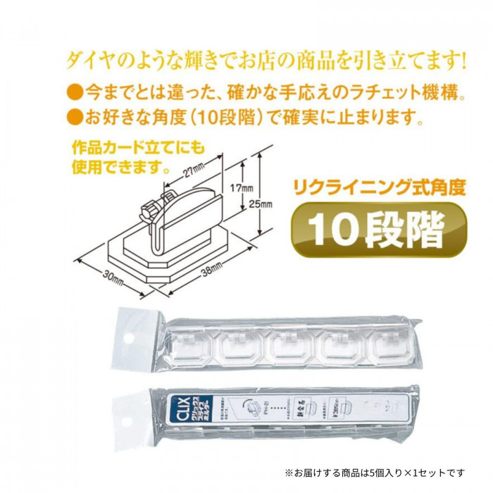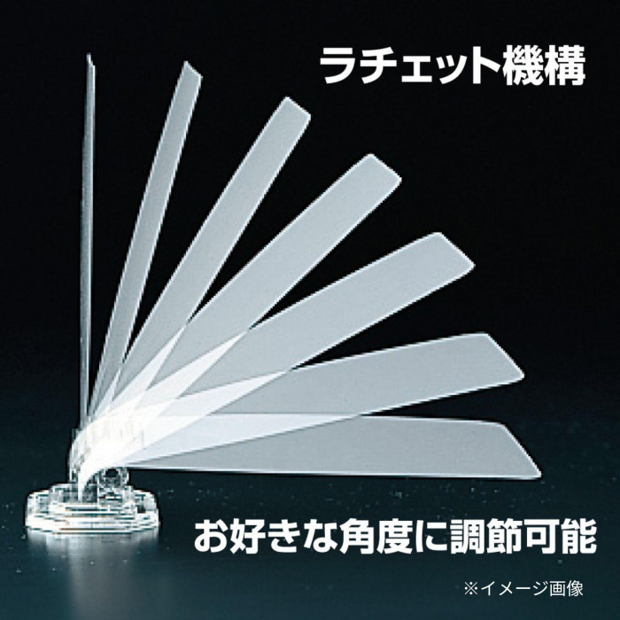 ラチェット機構式のプライスホルダー。お好きな角度(10段階)で確実に止まります。リクライニング式角度調節可能。ダイヤのような輝きでお店の商品を引き立てます。カードサイズはハガキ大まで使用可能です。作品カード立てにも使用できます。