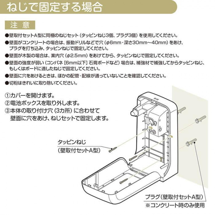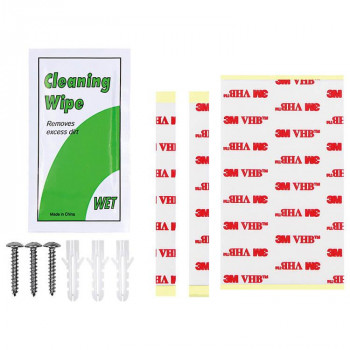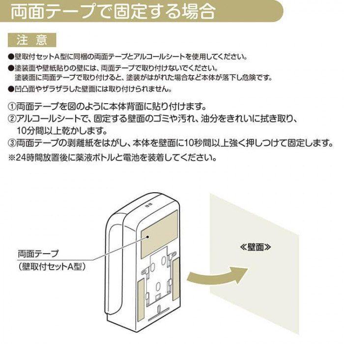 ノータッチディスペンサー(GUD-1000-PHJ)を壁付けするために必要なビス、両面テープ、アルコールシートのセット。両面テープはGUD-1000のサイズに合わせてカット済みです。