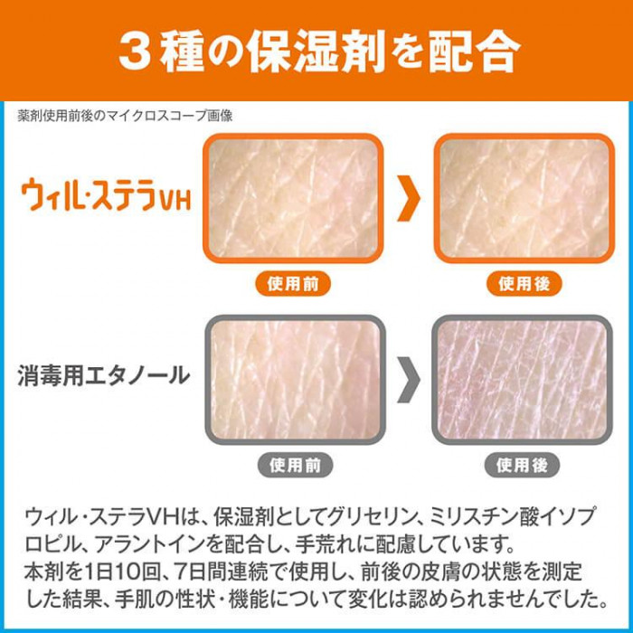| リン酸でpHを酸性にし、有効成分(エタノール)の効果を高めることによりノンエンベロープウイルスを含む幅広いウイルス・細菌に作用します。3種の保湿成分を配合し、手荒れに配慮しました。 ※直射日光の当たらない涼しい所に密栓して保管してください。 ※小児の手の届かない所に保管してください。 ※移し替える場合、専用の容器に品名と注意事項を明記してください。 ※取扱う場合、換気を十分行ってください。 ※火気に近づけないでください。 ※本剤はアルコールを含有しているため、床などの塗装面や衣服などについたりすると変色する場合があるので注意してください。 ※湿疹、皮ふ炎(かぶれ、ただれ)等の皮ふ障害があるときには、悪化する恐れがありますので使用しないでください。 ※かぶれたり刺激を感じたときは使用を中止し、医師に相談してください。 ※目に入った場合はすぐに洗い流してください。 |