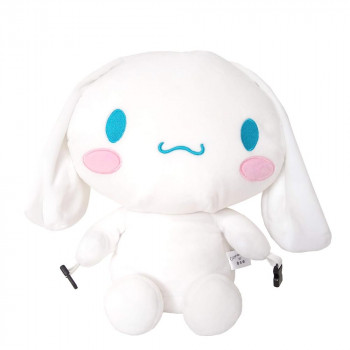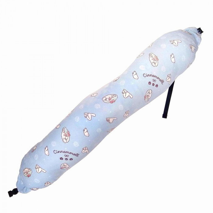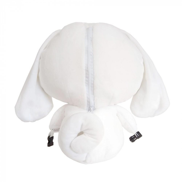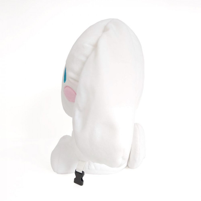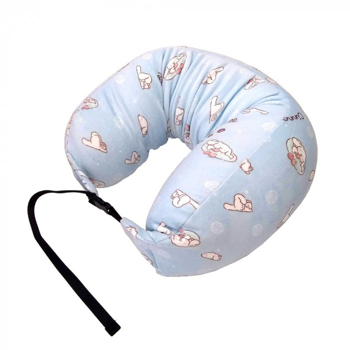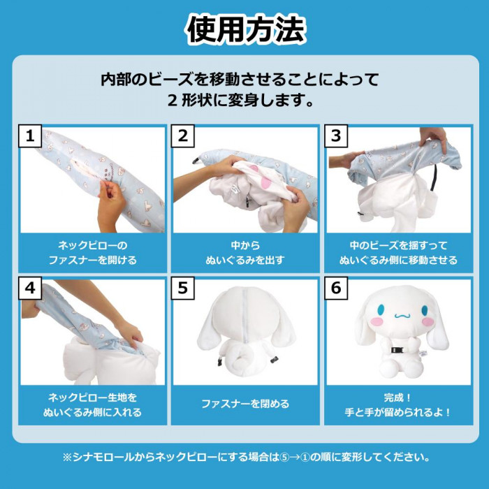 内側のビーズを移動させることによって2形状に変身します。手触りの良いベロア風生地を使用したネックピローは、キャラクターの総柄プリントです。長さ調節が可能なバックルベルト付き。ぬいぐるみの手にもバックルが付いているため、スーツケースやバッグに取り付けることが可能です。