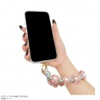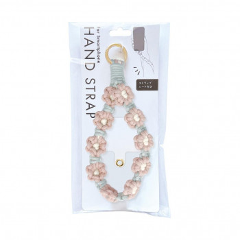 スマホケースに挟むだけで使用可能な落下防止ハンドストラップ。手編みの花デザインがかわいい。ハンドストラップ部分は鍵やポーチなどに付けてキーホルダーとしても使用可能。