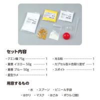 重曹50gブルー×1、重曹50gイエロー×1、クエン酸75g×1、カプセルφ45mm上パーツ×1、カプセルφ45mm下パーツ(色取り混ぜ)×1、スポイト2ml×1、蓄光紛約3g×1、ホログラムグリッター星ゴールド0.5g×1