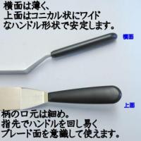 | スポンジケーキに生クリームを塗る作業時、手のひらでスパチュラが回転しやすいように工夫が凝らしてあります。柄元が細く、おしりの方に向かってコニカルに広がる柄が非常に握りやすく疲れにくいので、作業効率を高めます。また、柄の材質にはグリップ感がある150度もの熱に耐える樹脂を使用しており、食洗機等での丸洗いや熱湯消毒も可能で非常に衛生的なスパチュラとなっています。 ブレードの表面は鏡面仕上げなのも拭き取りやすいため衛生的です。ブレードがクランクしているType Cです。特にクレープなどを焼いた後にすくったりするのに重宝します。 ※モニターの発色の具合によって実際のものと色が異なる場合があります。 |