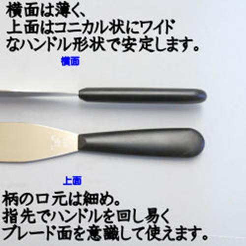 スポンジケーキに生クリームを塗る作業時、手のひらでスパチュラが回転しやすいように工夫が凝らしてあります。柄元が細く、おしりの方に向かってコニカルに広がる柄が非常に握りやすく疲れにくいので、作業効率を高めます。また、柄の材質にはグリップ感がある150度もの熱に耐える樹脂を使用しており、食洗機等での丸洗いや熱湯消毒も可能で非常に衛生的なスパチュラとなっています。