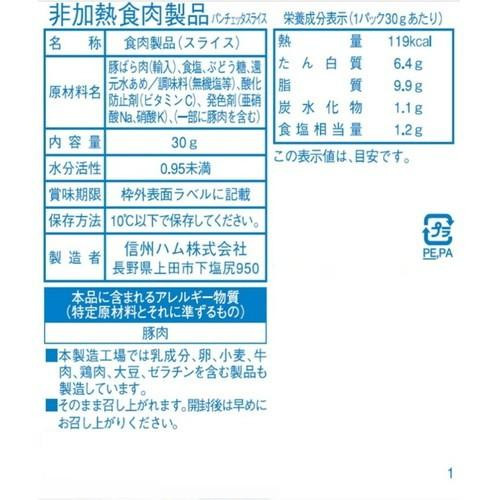 | 原材料 | 名称:食肉製品(スライス) 豚ばら肉(輸入)、食塩、ぶどう糖、還元水あめ/調味料(無機塩等)、酸化防止剤(ビタミンC)、発色剤(亜硝酸Na、硝酸K) |
