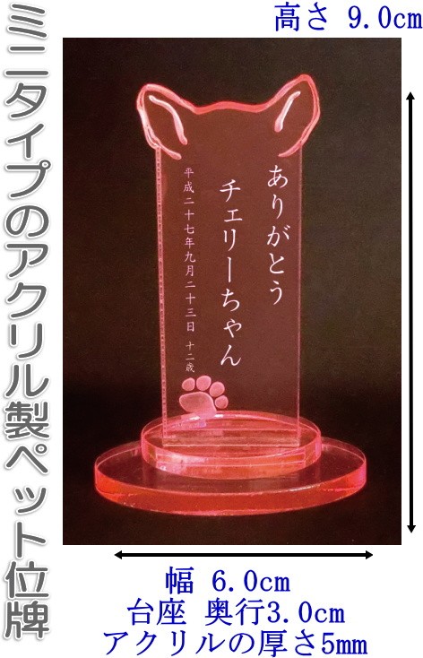4301Pペットの名前が入るありがとうペットミニアクリル位牌 こうもり耳ドックピンク DOG メモリアルプレート